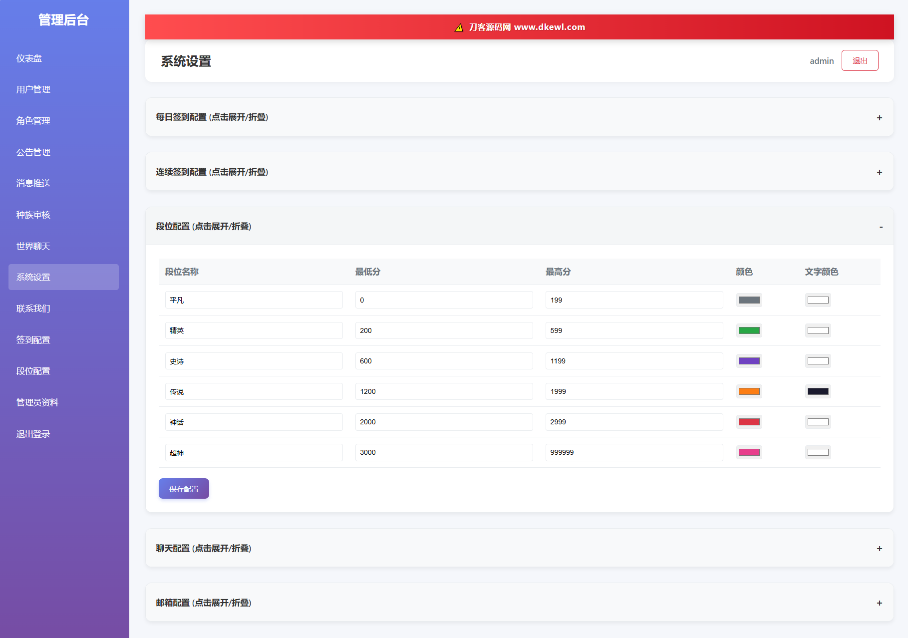 段位配置 :设置不同战斗力区间的段位名称和图标。
